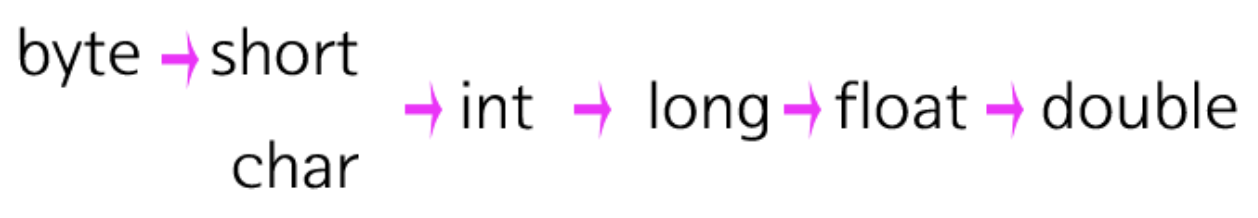 - 암시적 형변환(Implicit Conversion) : 표현범위가 좁은→넓은 데이터타입으로 변환만 허용 (ex. float → double)