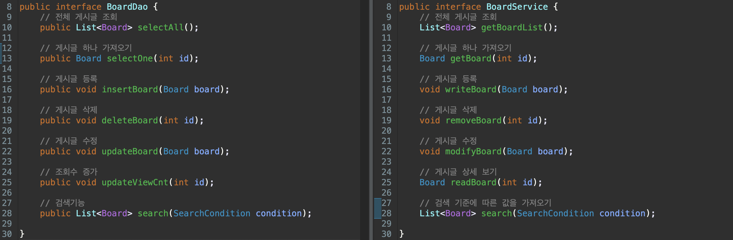 - Dao인터페이스의 함수명과 그에 대응하는 mapper(board.xml)의 id와 일치해야함