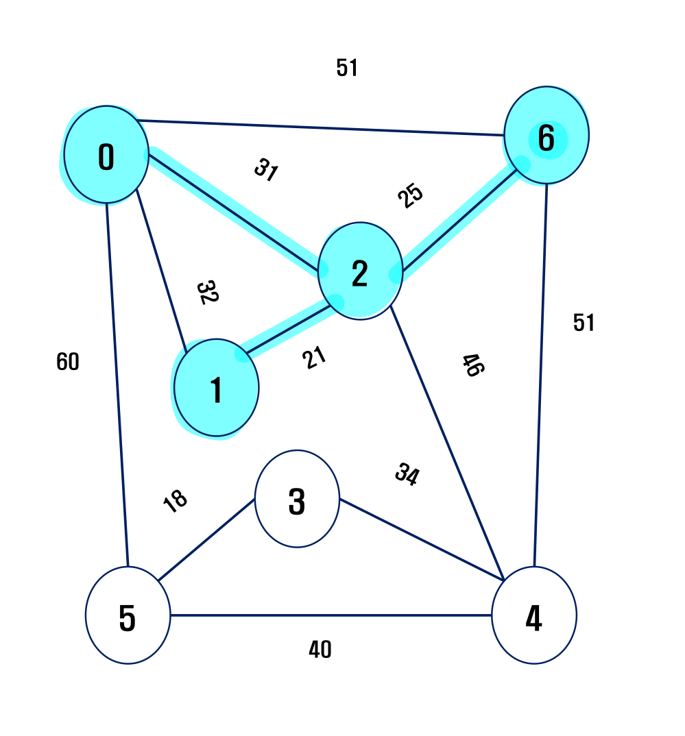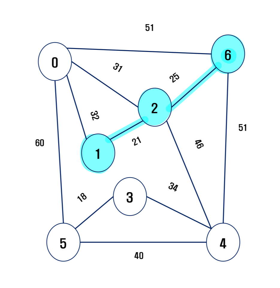 - 2번과 연결된 노드들 0번(31), 1번(21), 4번(46), 6번(25)들이 원래 가진 keys값들 보다 작으면 갱신하자.